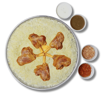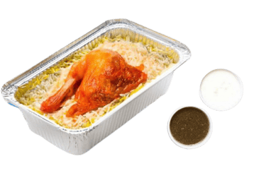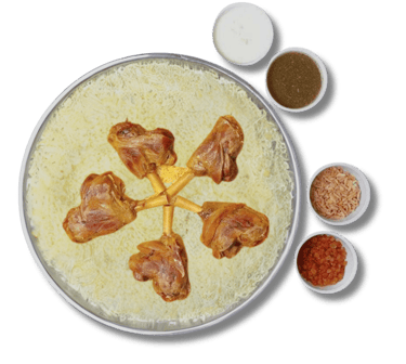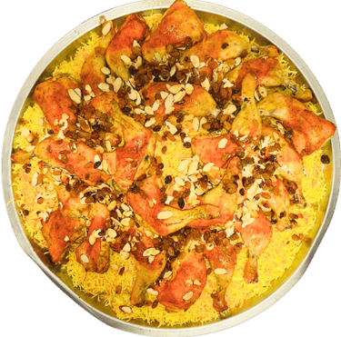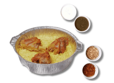 12 pieces of chicken served with mandi rice, almonds and raisins, 6 spicy sauces, and 6 yogurt sauces.