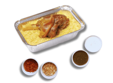5 pieces of lamb shanks served with mandi rice, 5 spicy salads, and 5 yogurt salads, adding almonds or raisins is extra.