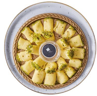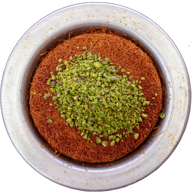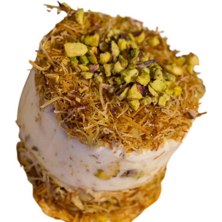 Osmalia consists of two layers of toasted kunafa hair, stuffed with cream and nuts.